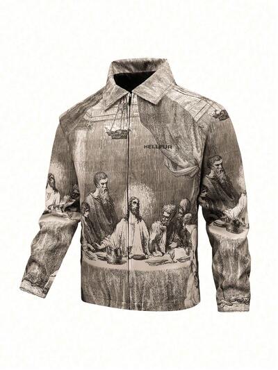 Men's Plus Size Portrait Print Zipper Placket Long Sleeve Jacket-23%