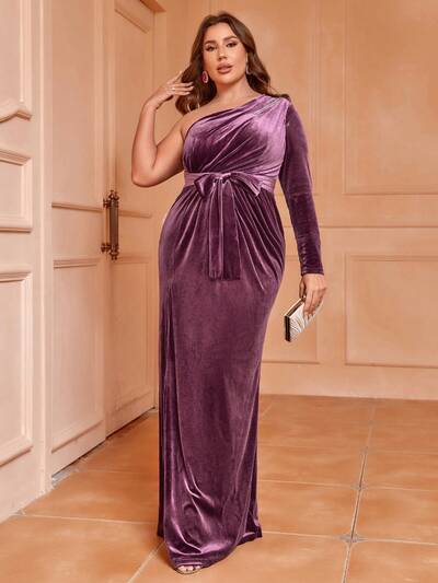 Plus One Shoulder Bow Detail Ruffle Trim Satin Dress