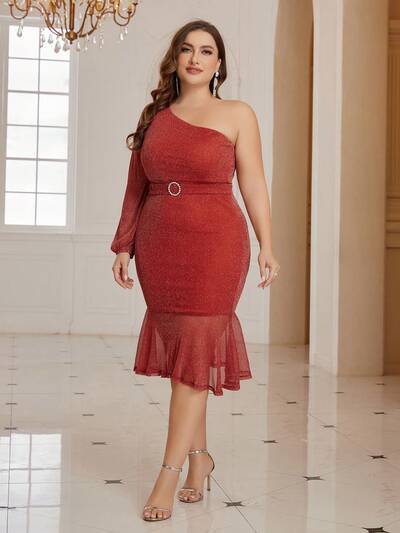 Plus Asymmetrical Neck Ruffle Trim Split Thigh Glitter Formal Dress