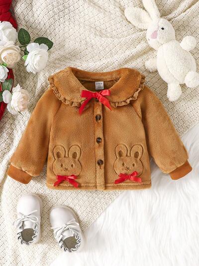 Baby Girl Cartoon Embroidery Peter Pan Collar Bow Front Jacket-65%