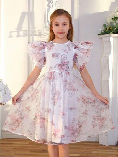 Tween Girls' Floral Print Organza Dress With Round Neckline, Layered Ruffle Sleeves-44%
