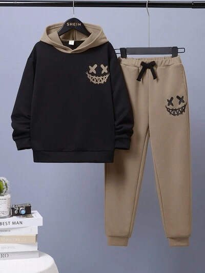 Tween Boy Expression Print Hoodie & Drawstring Waist Sweatpants