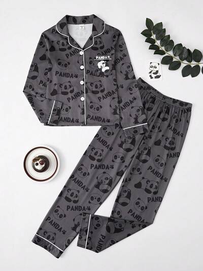 Tween Boys' Panda Pattern Printed Button-Down Pajama Set