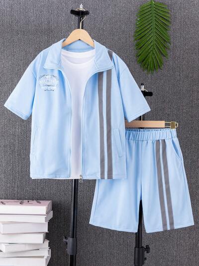 Tween Boy Color Block Striped Short Sleeve Zip-Up Top And Shorts Set, Summer