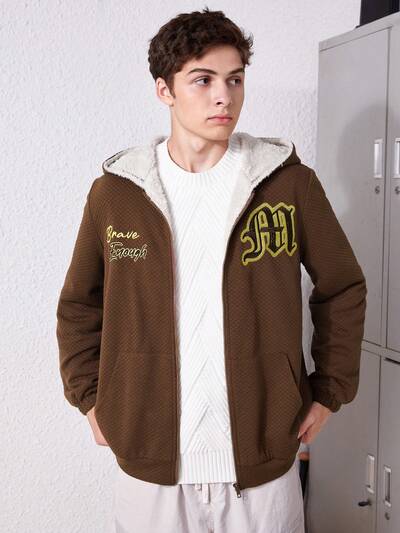 Teen Boy Letter Embroidery Zip Up Thermal Lined Hooded Coat-65%