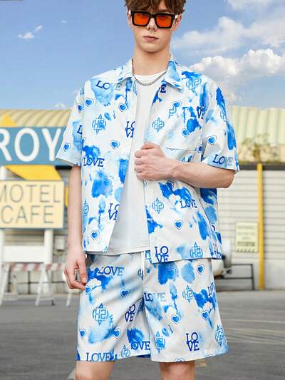 Teenage Boys' Style Printed Open Front Shirt And Shorts Two Piece Set-55%