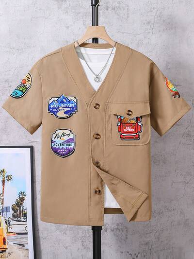 Teen Boy Summer Casual Badge Printed Short Sleeve Shirt-46%