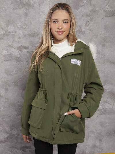 Teen Girl Letter Patched Drawstring Waist Hooded Padded Coat