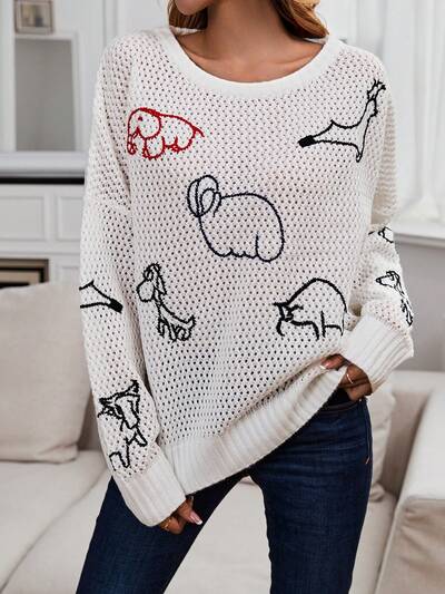Cartoon Pattern Drop Shoulder Pointelle Knit Pullover Fall Winter Sweater-60%