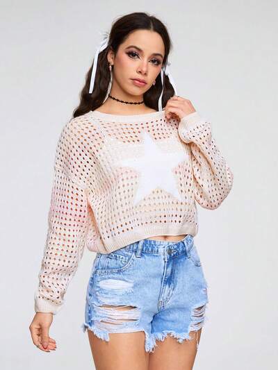 Women's Round Neck Gradient Color Star Pattern Hollow Out Long Sleeve Sweater-60%