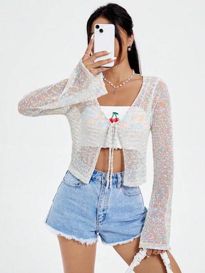 Casual Space Dye Blended Fabric Perspective Style Tie Front Y2k Cardigan-35%