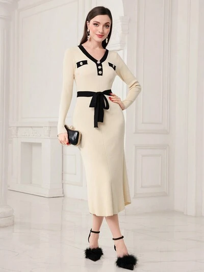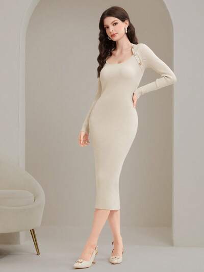 Button Decorated Bodycon Sweater Dress, Elegant Style-35%