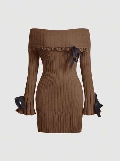 Ladies' Slim Fit Off Shoulder Lace Edged Tie Knit Sweater Dress-60%