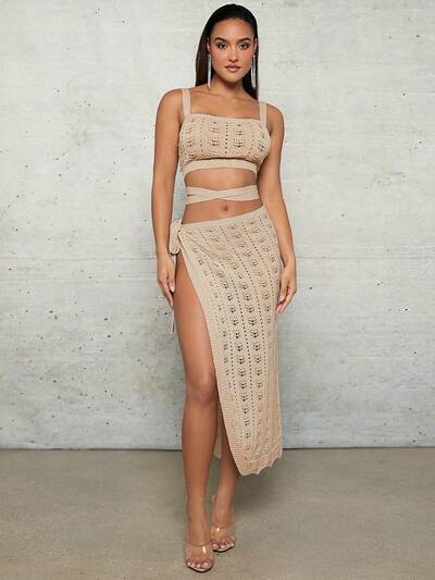 Cover Ups Apricot Crocheted Hollow High Slit Strap Spring And Summer Holiday Clothes See-Through Women's Skirt-35%