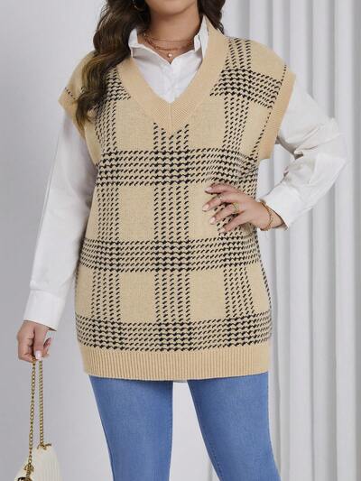 Women's Plus Size V-neck Knitted Sweater Vest With Plaid Pattern-60%