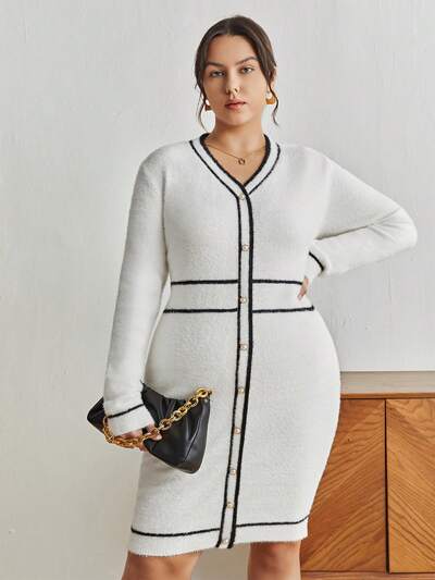 Women's Plus Size Color Block Buttoned Slim Fit Sweater Dress With Rolled Edges-60%