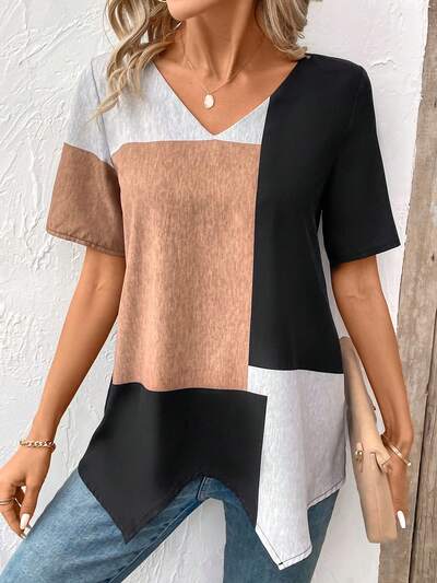 Women's Contrast Patchwork Asymmetric Hem Shirt-32%