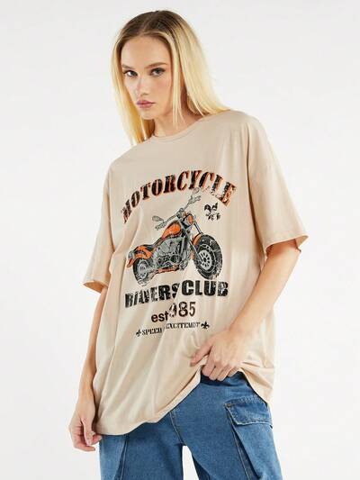 Women's Casual Letter & Motorcycle Print T-Shirt With Contrast Color Edge-32%