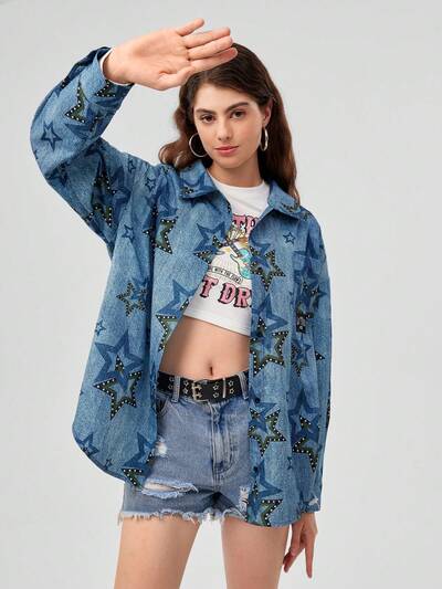 Women's Star Print Drop Shoulder Shirt-65%