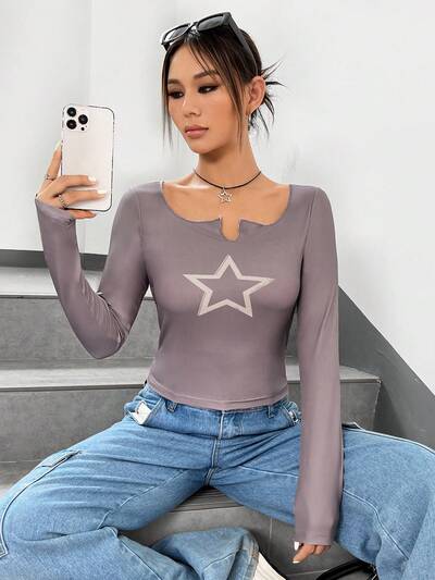 Star Print Notched Neck Tee-32%