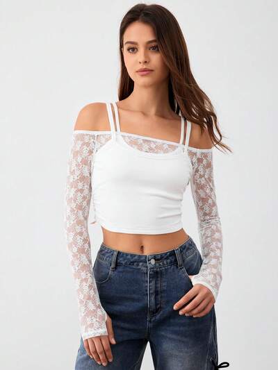 Lace Off Shoulder 2 In 1 Joint Sweet Girl College Style Slim Fit Top