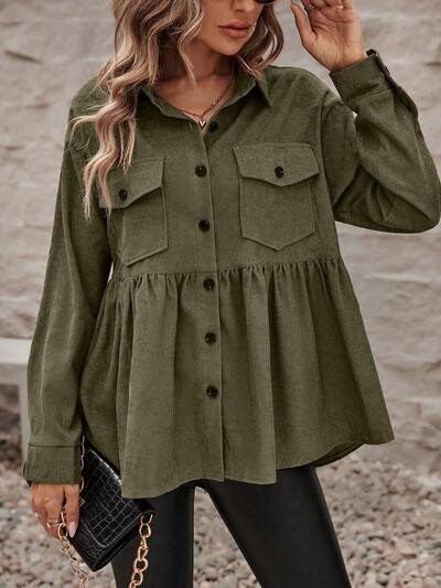 Women's Flap Pocket Ruffle Hem Shirt,Long Sleeve Tops-46%