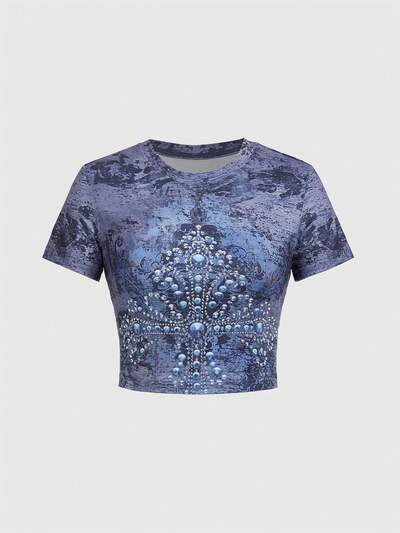 Tie-Dye Cross Print Rhinestones Embellished Cropped Slim Fit T-Shirt