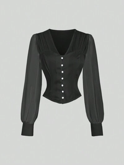 Women's Solid Color Lantern Sleeve Waist Cinched Shirt Fall Cloth For Women-33%