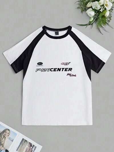 Women's Fashionable Short-Sleeved Shirt With USA Letter Print And Color-Block Hem