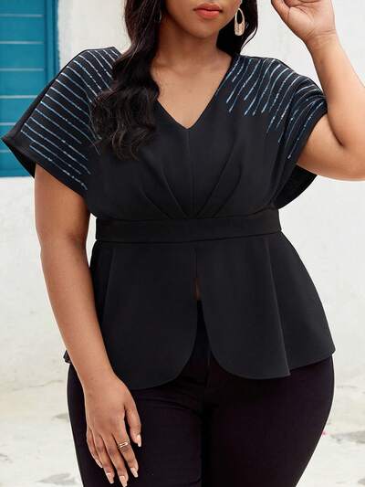 Plus Size Summer Casual T-Shirt With Sequin Decoration, Batwing Sleeve, Cinched Waist And Side Split