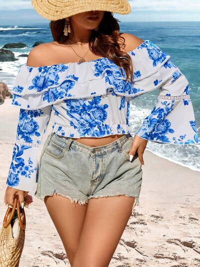 Plus Size Women's Floral Printed Off Shoulder Vacation Top