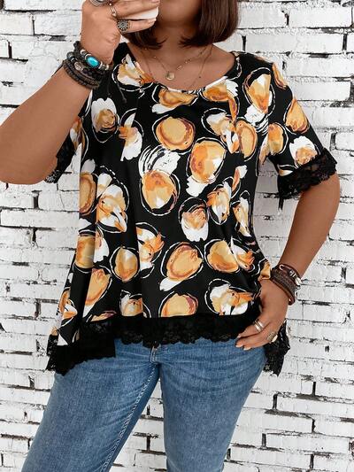 Plus Size Printed Patchwork Lace T-Shirt-30%