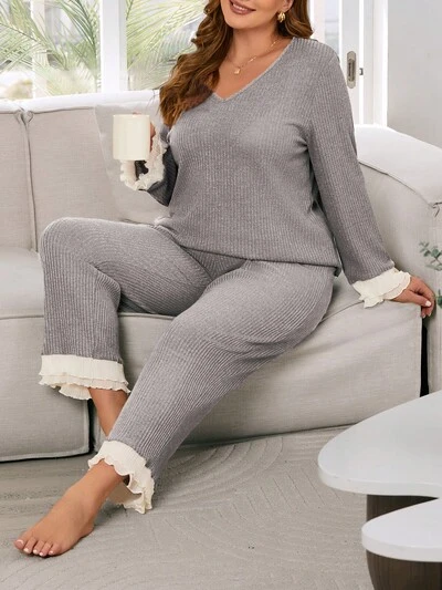Plus Size Long Sleeve Pajama Set With V-Neck And Patchwork Detailing-27%
