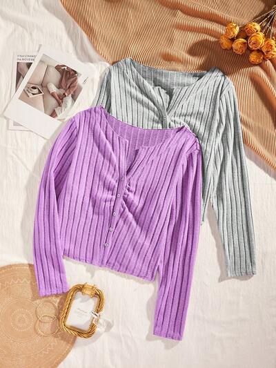 Women Casual Multicolor Rib-Knit V Neck Sleep Top With Button Front Detail And Regular Sleeves, Medium Stretch Polyester Loungewear-18%