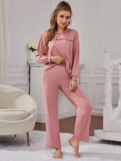 Slogan Graphic Drop Shoulder Drawstring Hooded Lounge Set-60%