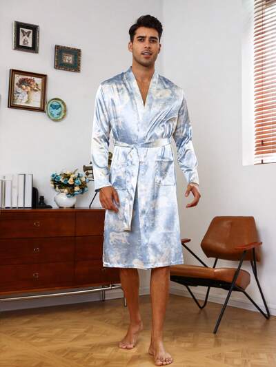 Men Floral Print Dual Pockets Belted Sleep Robe-60%