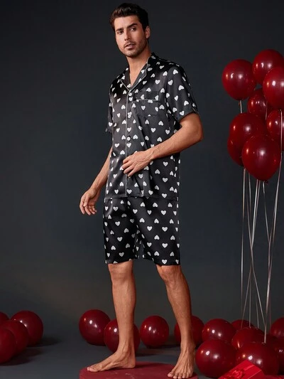 Valentine's Day Men Heart Print Buttoned Short Sleeve Top And Shorts Loungewear Set-60%