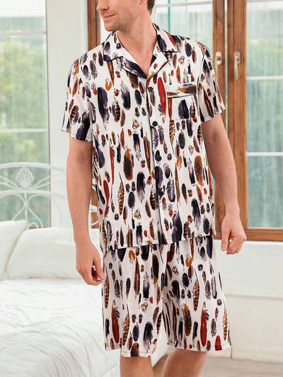 Men's Feather Pattern Printed Short Sleeve And Shorts Homewear Set-57%
