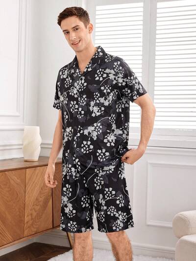Men'S Floral Print Short Sleeve Shirt And Shorts Homewear Set