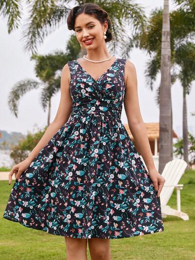 Pleated Deep V-Neckline Cinching Waisted Dress