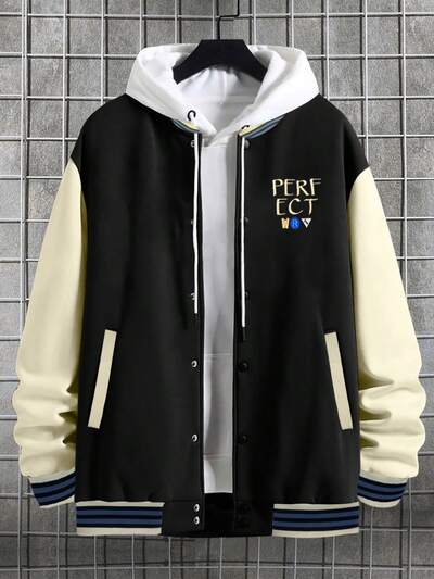 Men Plus Letter Graphic Two Tone Varsity Jacket Without Hoodie-60%