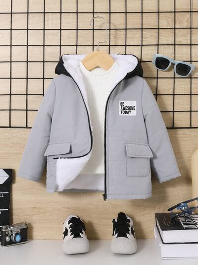 Baby Boy 1pc Letter Patched Flap Pocket Zipper Hooded Thermal Lined Padded Coat-60%