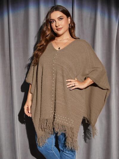 Plus Tassel Hem Batwing Sleeve Knit Poncho-65%