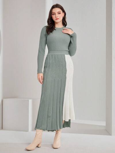 Women's Round Neck Sweater And Color Block Knitted Skirt Set 2 Piece Set-60%