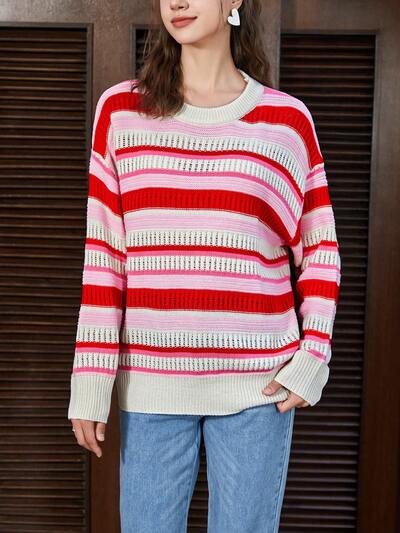 Striped Pattern Drop Shoulder Pointelle Knit Sweater-60%