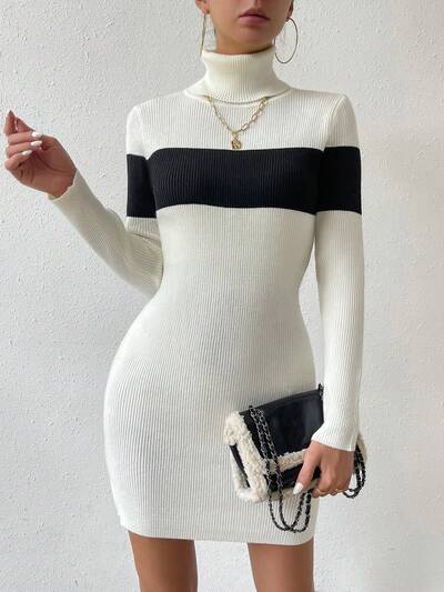 Women's Color Block Turtleneck Sweater Dress Fall Cloth For Women-60%