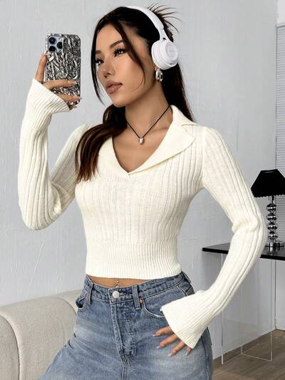Women's Lapel Tight White Knit Pullover Fall Winter Sweater-60%