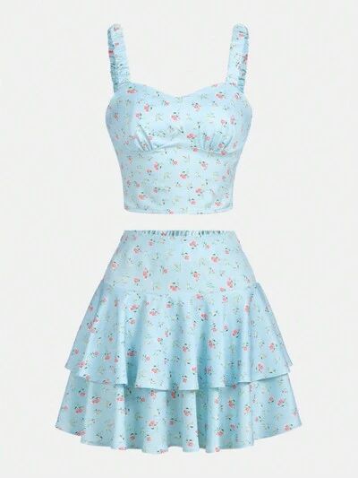 Teen Girl Woven Floral Printed Cami Top With A Skirt Set