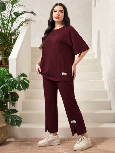Burgundy Red Plus Letter Patched Drop Shoulder Tee & Split Hem Pants 2 Piece Set-29%