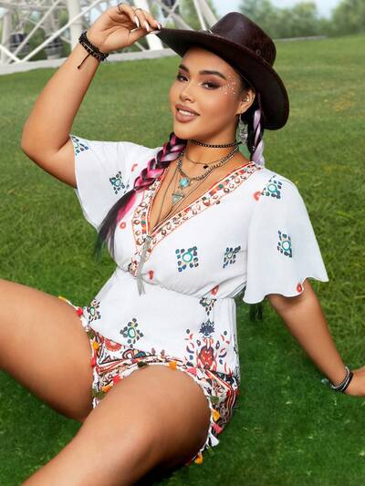 Plus Size Women's Geometric Print Ruffled Sleeve Romper